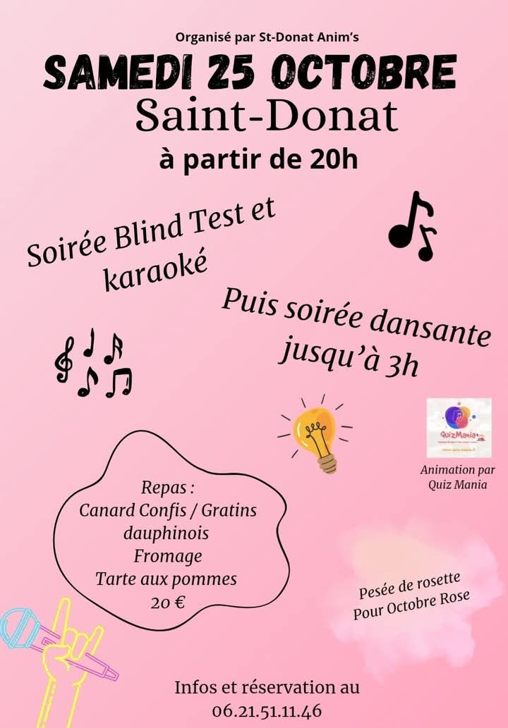 St-Donat Anim's le 25 octobre soirée Blind Test et Karaoké- Repas- pesée de rosette pour Octobre Rose- soirée dansante infos et réservations 06 21 51 11 46 canard confit / gratin dauphinois fromage tarte aux pommes 20€