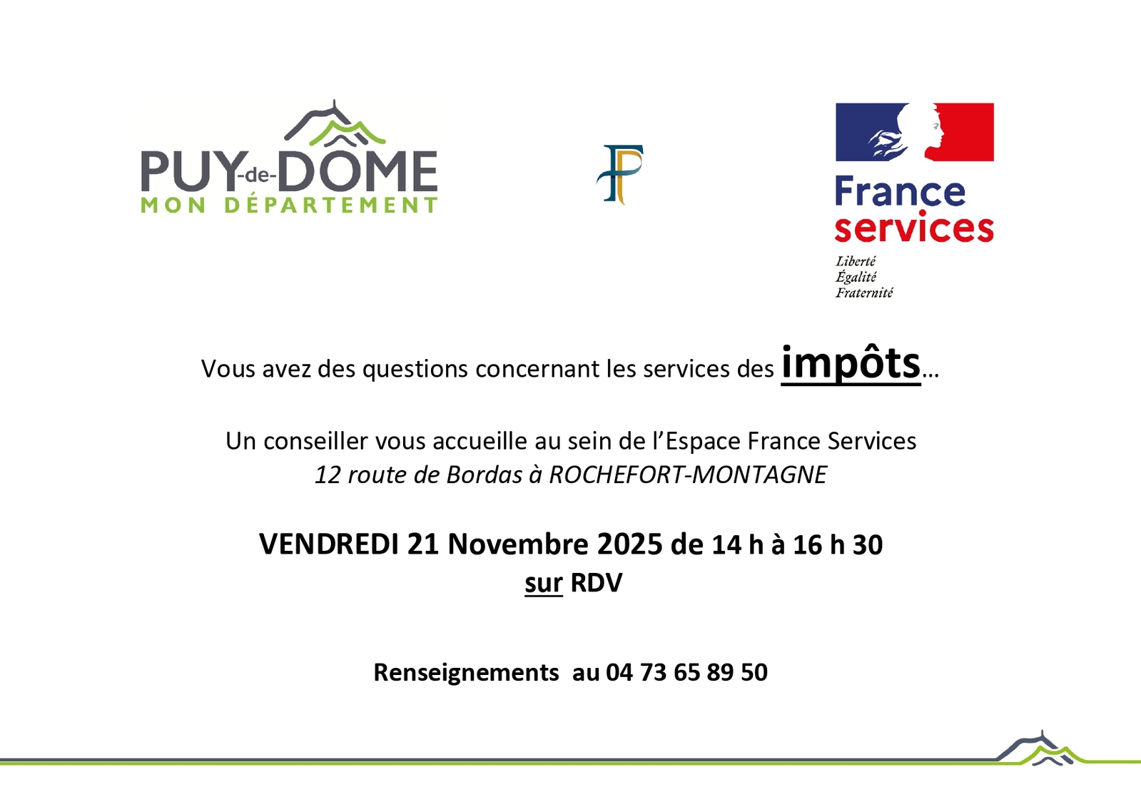 Permanence DDFIP le 21 novembre Rochefort de 14h à 16h30 sur RDV renseignements 04 73 65 89 50