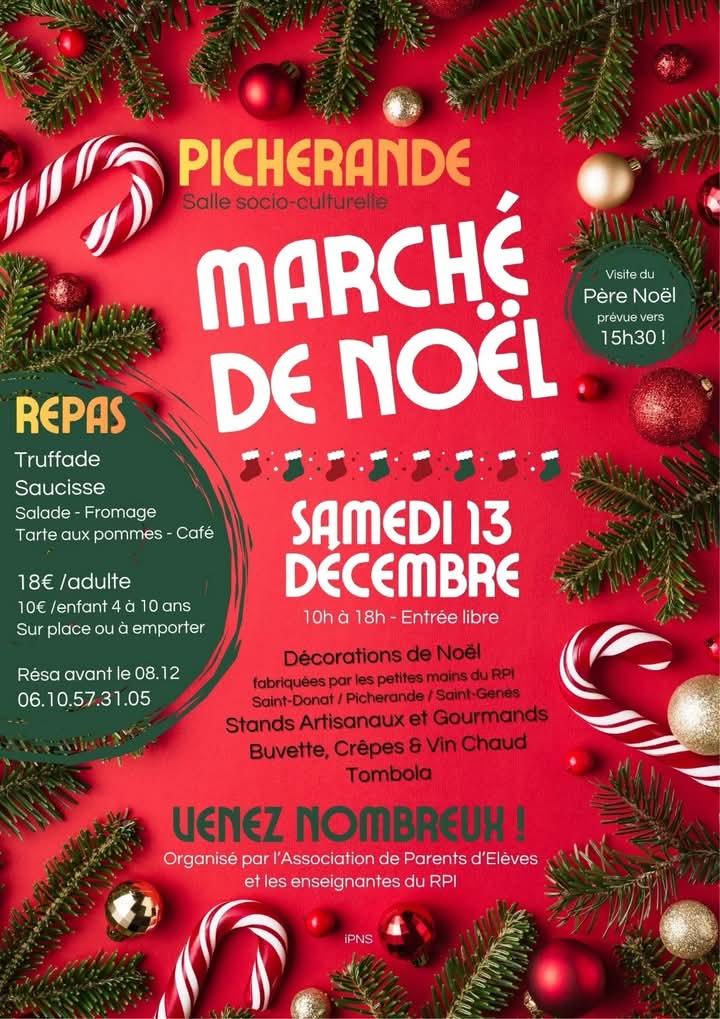 APE marché de Noël à Picherande le 13 décembre de 10h à 18h Repas reservations 061057 31 05 avant le 8 12
