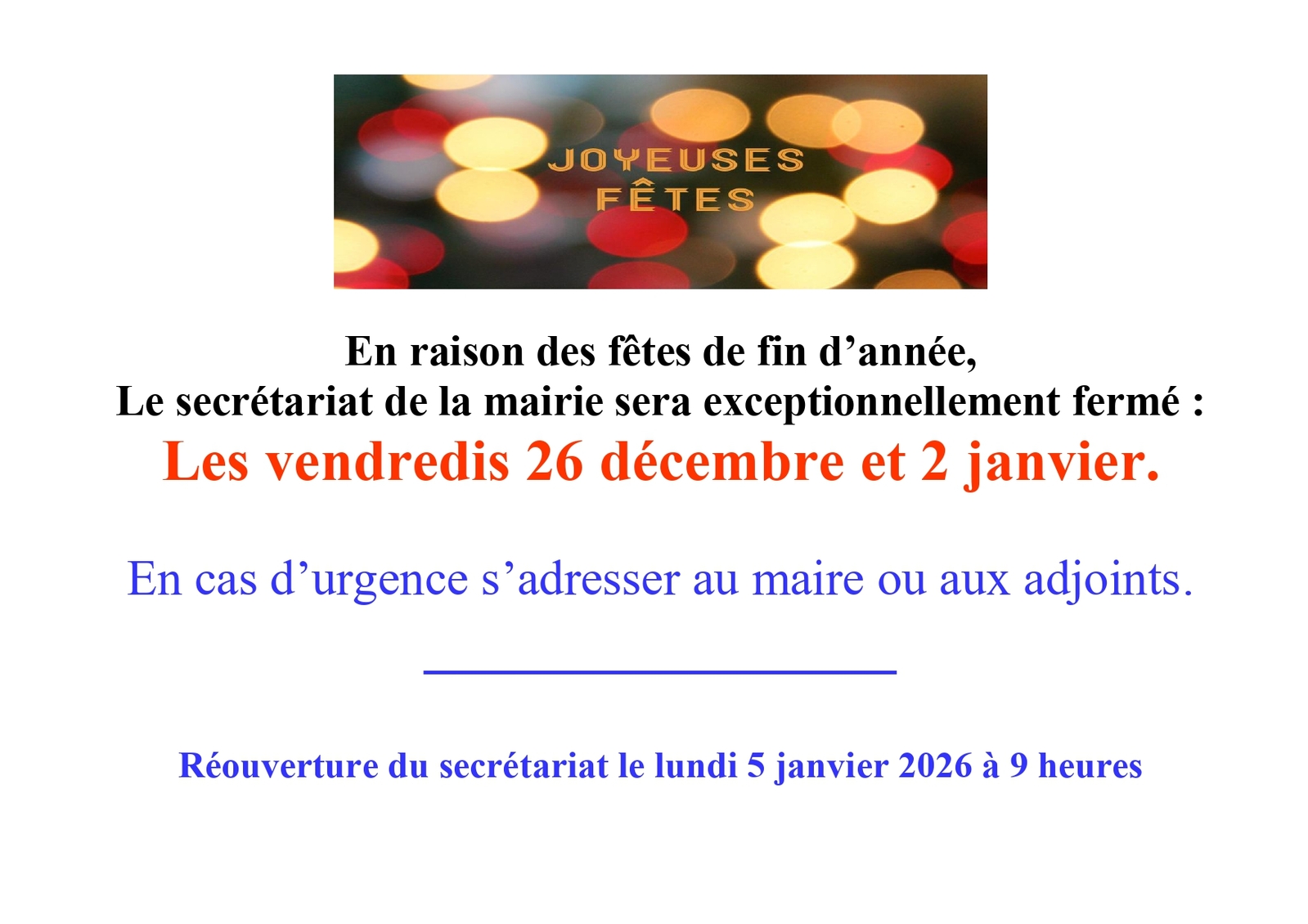 secrètariat de Mairie fermeture fêtes de fin d'année les vendredis 26 décembre 2025 et 2 janvier 2026. réouverture le 5 janvier à 9 Heures.