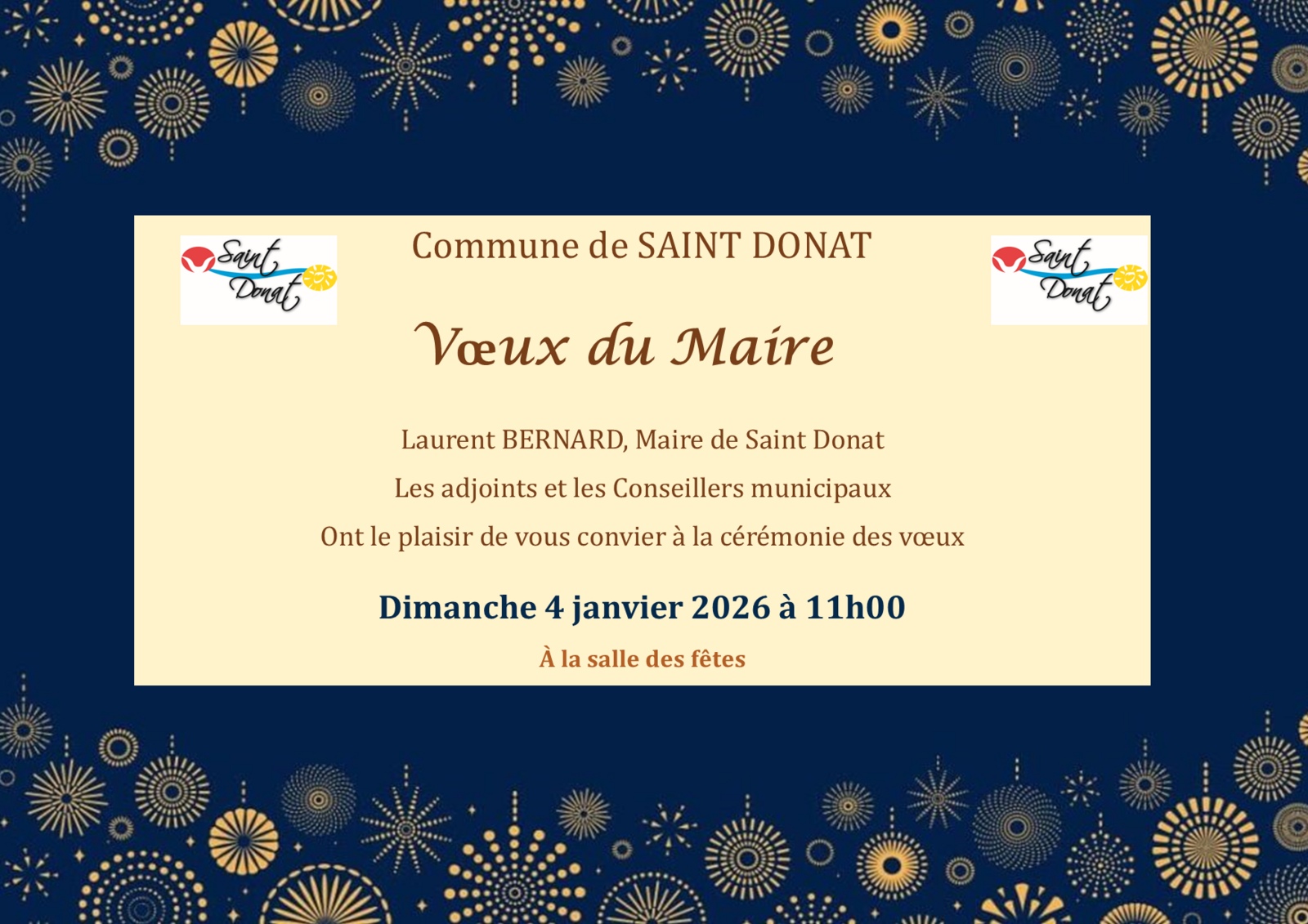 Cérémonie voeux du Maire dimanche 4 janvier 2026 à 11 Heures salle des fêtes